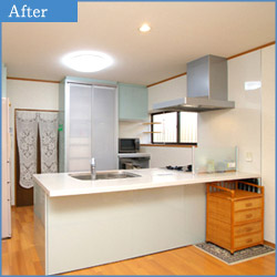 高齢の母が一人で住んでいる実家に戻り同居するため、リフォームを考えました。キッチンと居間が仕切られていて狭く暗いので、家族が協力して料理ができる広くて明るいキッチンにしたいと相談しました。