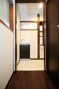選んでくれたトイレの背面クロスや手洗器が既存の柱とマッチして、とても素敵なトイレになりました。